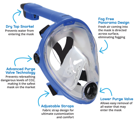 The only full face mask line available on the market featuring updated purge valve technology that eliminates the risk of re-breathing dangerous levels CO2 while snorkeling. Learn more here.